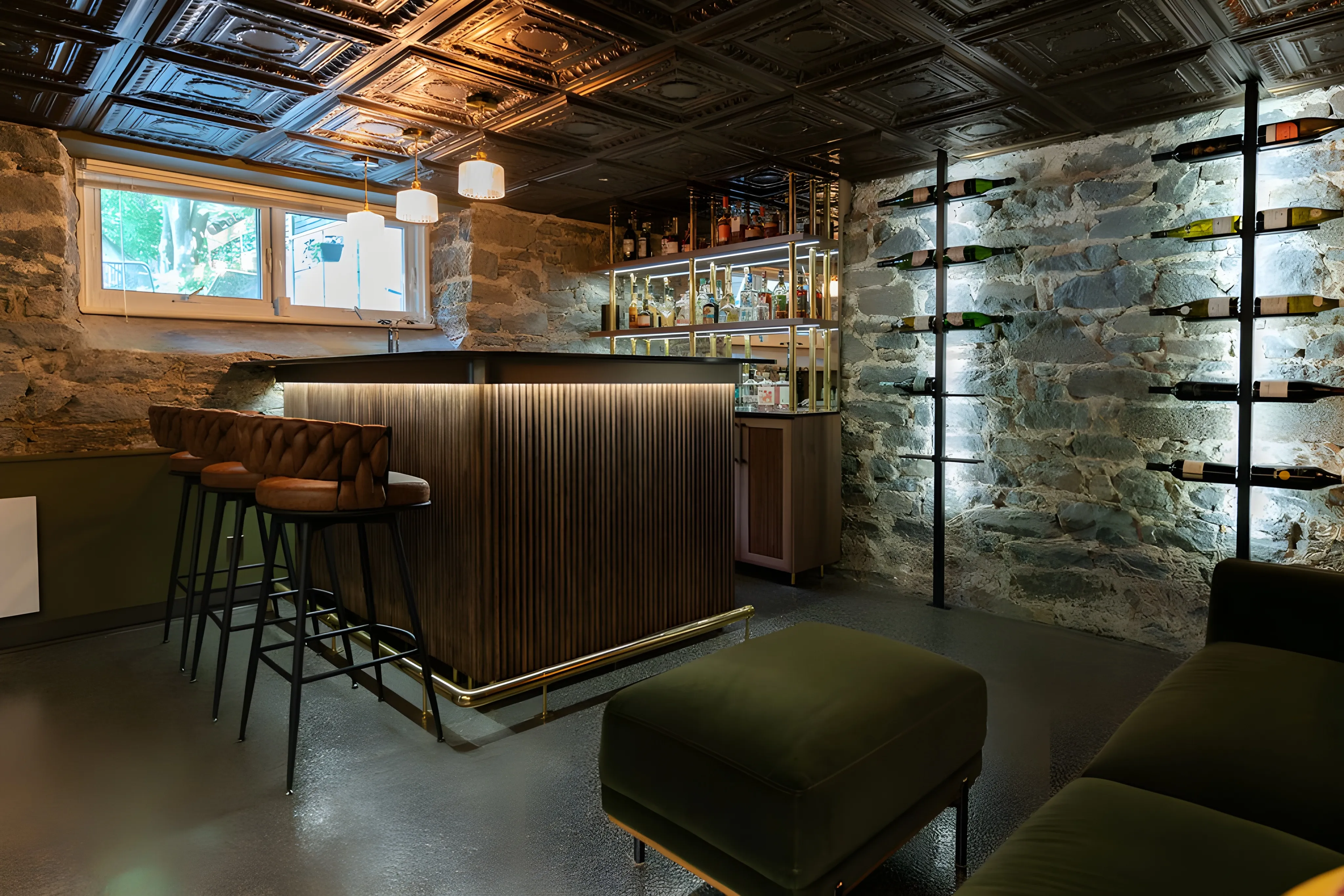 Aménagement d’un espace bar au cachet unique, où la pierre naturelle, l’éclairage sur mesure et les matériaux nobles se rencontrent pour créer une ambiance chaleureuse et raffinée. Un projet qui allie caractère, fonctionnalité et souci du détail.